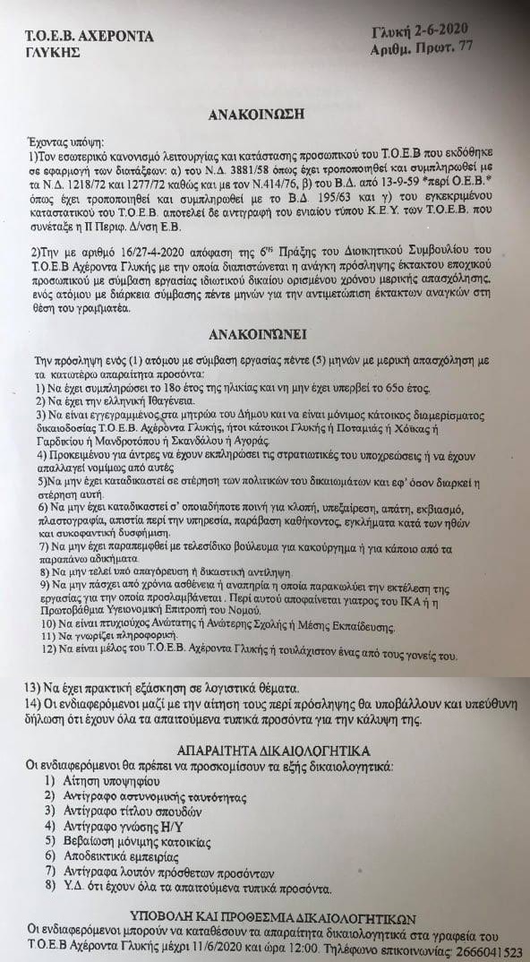 Πρόσληψη ατόμου στον ΤΟΕΒ Γλυκής Μέχρι τις 11 Ιουνίου οι αιτήσεις. Προσόντα και δικαιολογητικά 05|06|2020