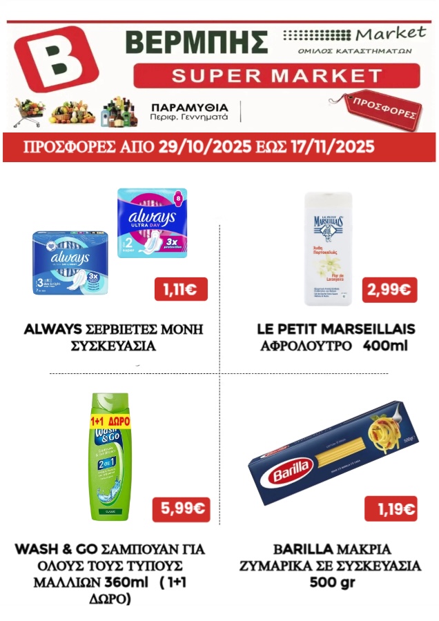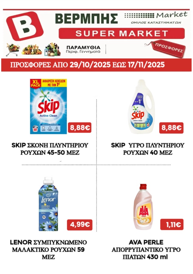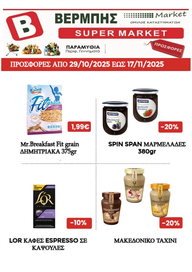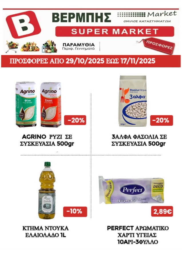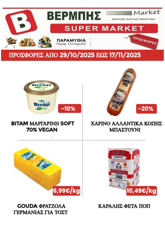 Δείτε το Φυλλάδιο Προσφορών από τα Super Market “ΒΕΡΜΠΗΣ” Περιφερειακός Γεννηματά - Παραμυθιά 28|10|2025