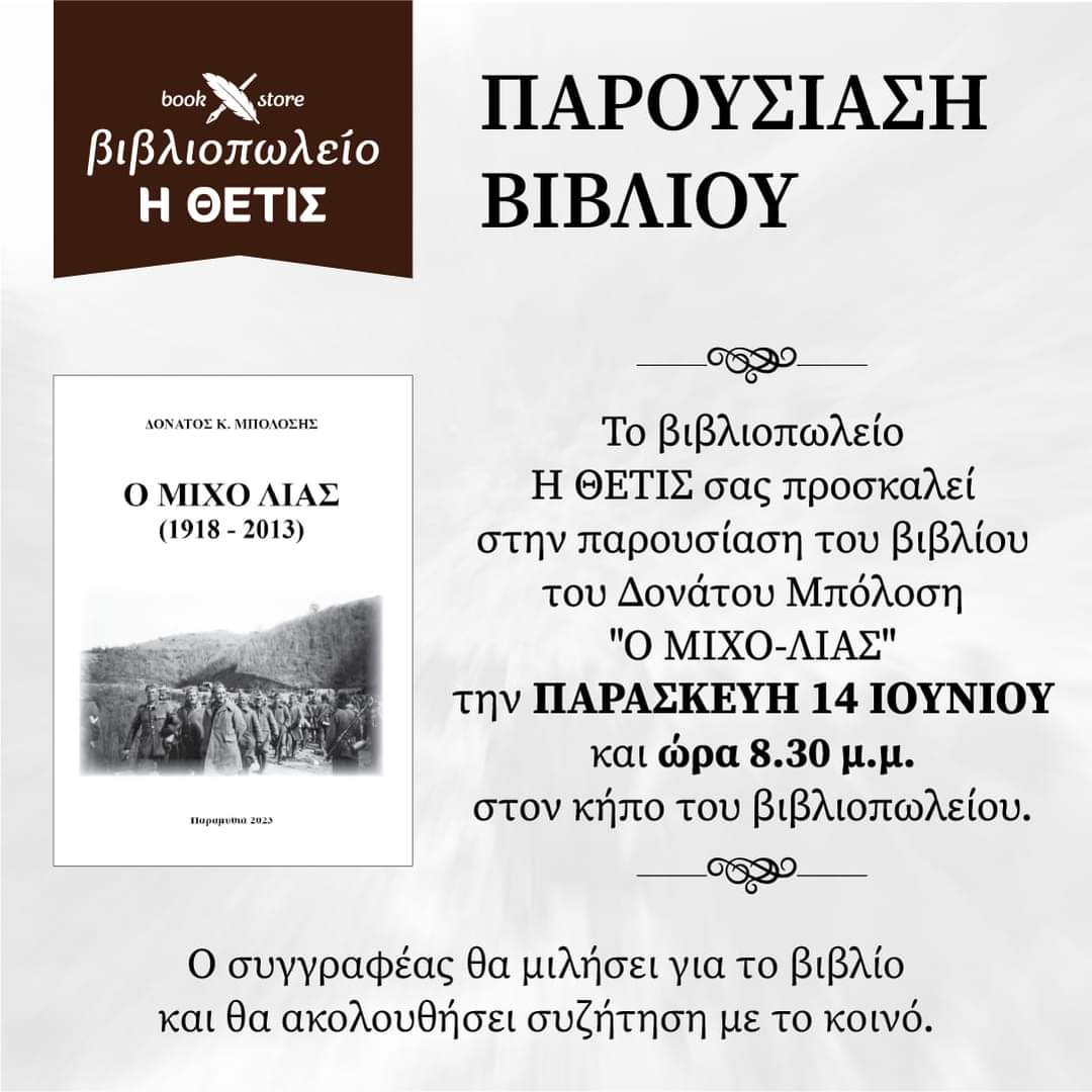Το βιβλίο “Ο ΜΙΧΟ ΛΙΑΣ” παρουσιάζει ο συγγραφέας Δονάτος Μπόλοσης την Παρασκευή στις 20:30 στο κήπο του βιβλιοπωλείου “Η Θέτις”