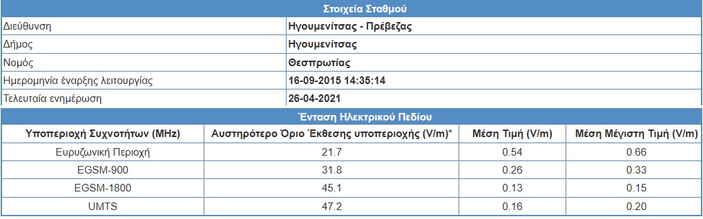 Με σκοπό τον ανά τακτά χρονικά διαστήματα διενεργούμενο έλεγχο της τήρησης των θεσμοθετημένων ορίων ασφαλούς έκθεσης του κοινού στα ηλεκτρομαγνητικά πεδία, το Εθνικό Παρατηρητήριο Ηλεκτρομαγνητικών Πεδίων εχει τοποθετήσει 4 σταθμούς μέτρησης στη Θεσπρωτία.