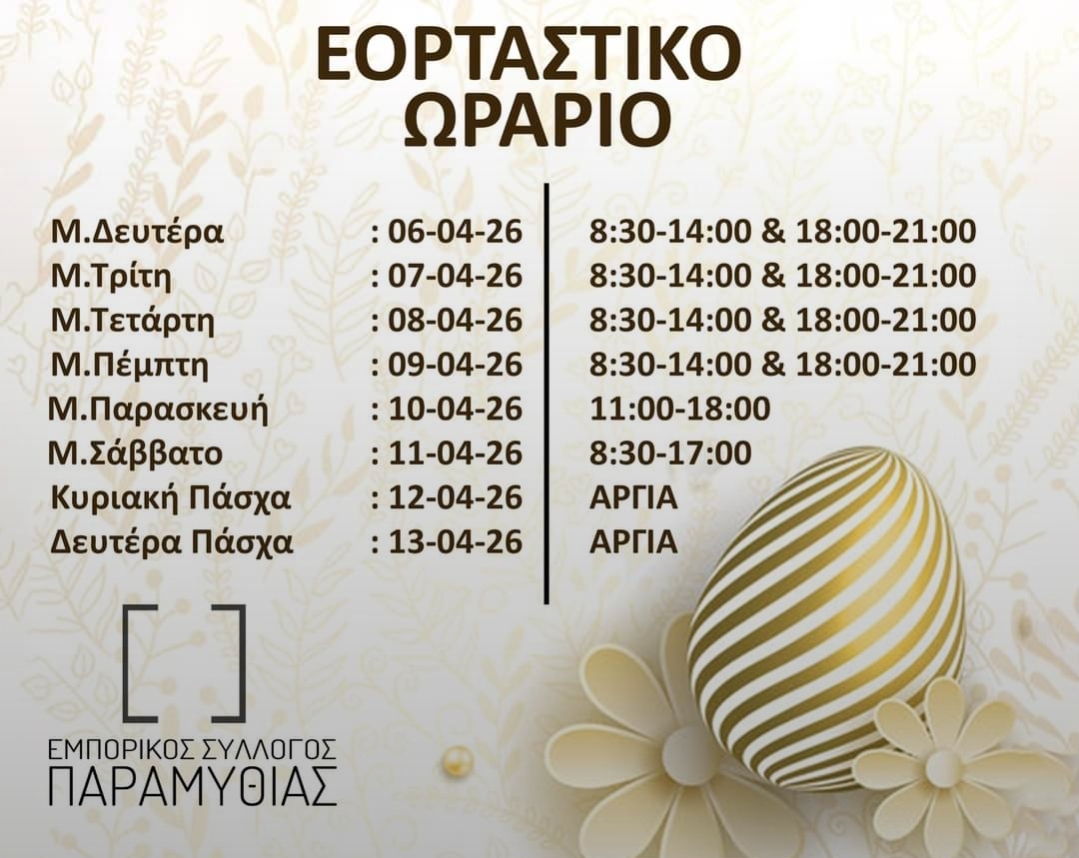 Ο Εμπορικός Σύλλογος Παραμυθιάς ενημερώνει το καταναλωτικό κοινό και τους επαγγελματίες της περιοχής για το εορταστικό ωράριο λειτουργίας των καταστημάτων ενόψει της Μεγάλης Εβδομάδας και του Πάσχα 2026