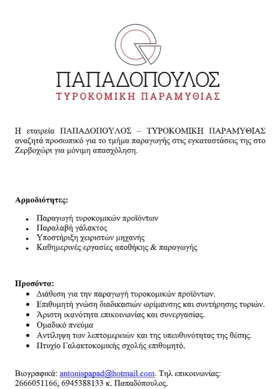 Προσωπικό για μόνιμη απασχόληση αναζητεί εταιρεία “Παπαδόπουλος – Τυροκομική Παραμυθιάς” Αγγελία 31|10|2025