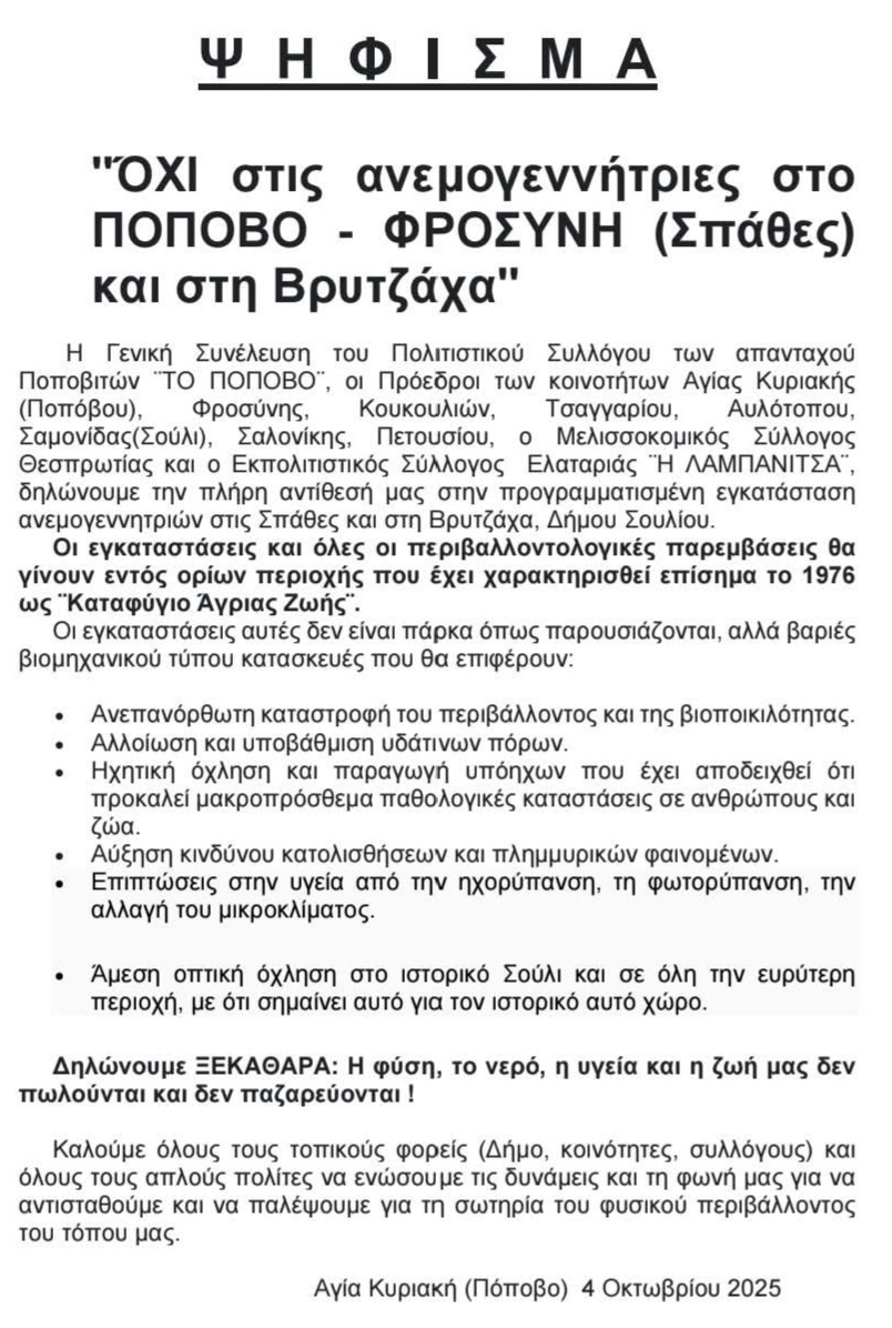Οχι στις ανεμογεννήτριες σε Πόποβο και Σούλι