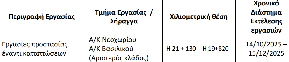 Α. Κατά την εκτέλεση εργασιών στα πλαίσια συντήρησης της Εγνατίας Οδού, να εφαρμοσθούν κυκλοφοριακές ρυθμίσεις, όπως αυτές αποτυπώνονται στον κατωτέρω πίνακα: