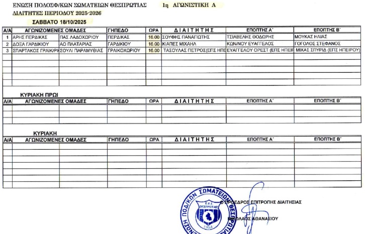 Με 3 αγώνες ξεκινάει σήμερα Σάββατο 18 Οκτωβρίου, το πρωτάθλημα της Α κατηγορίας της ΕΠΣ Θεσπρωτίας.