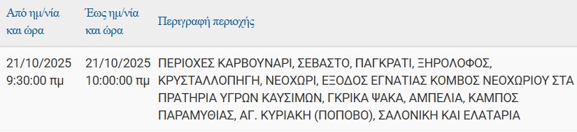 Προκειμένου να προγραμματίσετε τις εργασίες σας και να ελαχιστοποιηθεί η όχλησή σας, στον ακόλουθο πίνακα, μπορείτε να ενημερωθείτε για τις περιοχές και τις ώρες προγραμματισμένων διακοπών ηλεκτροδότησης.