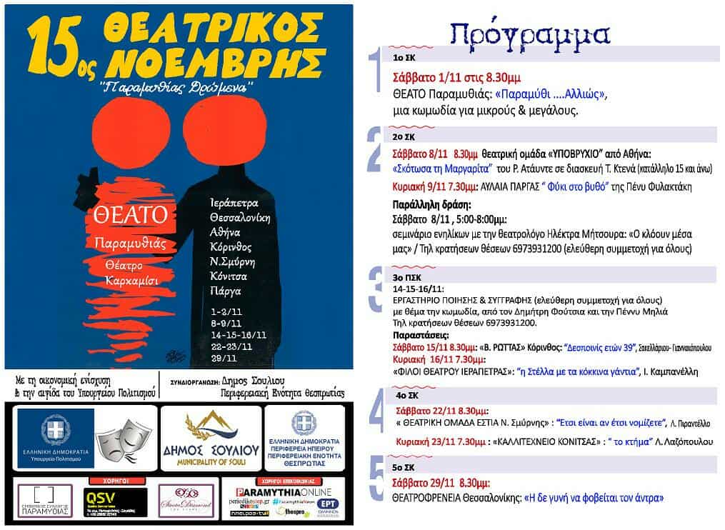 Η γιορτή του Θεάτρου, θα διαρκέσει ολο τον μήνα με συνεχής παραστάσεις κάθε Σαββατοκύριακο απο Θεατρικές ομάδες απο Αθήνα, Θεσσαλονίκη, Κρητη, Κόρινθο, Κόνιτσα και Πάργα.