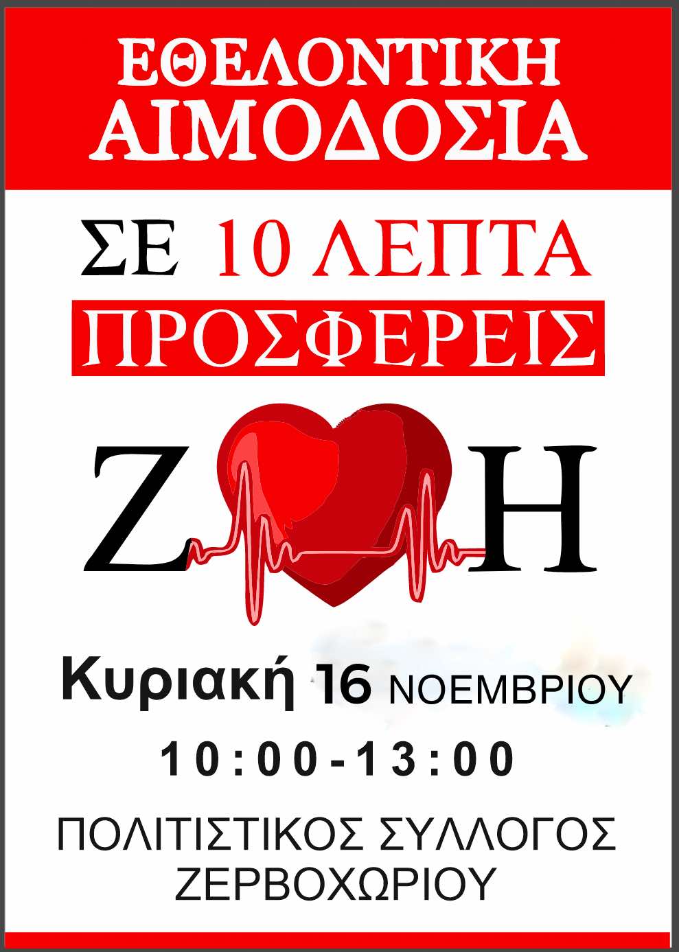 Την Τρίτη 16 Νοεμβρίου, κινητή μονάδα αιμοδοσίας, θα βρίσκεται στο αίθουσα του Πολιτιστικού Συλλόγου Ζερβοχωρίου από τις 10:00 έως τις 1¨3:00, στα πλαίσια των δράσεων της εθελοντικής αιμοδοσίας.