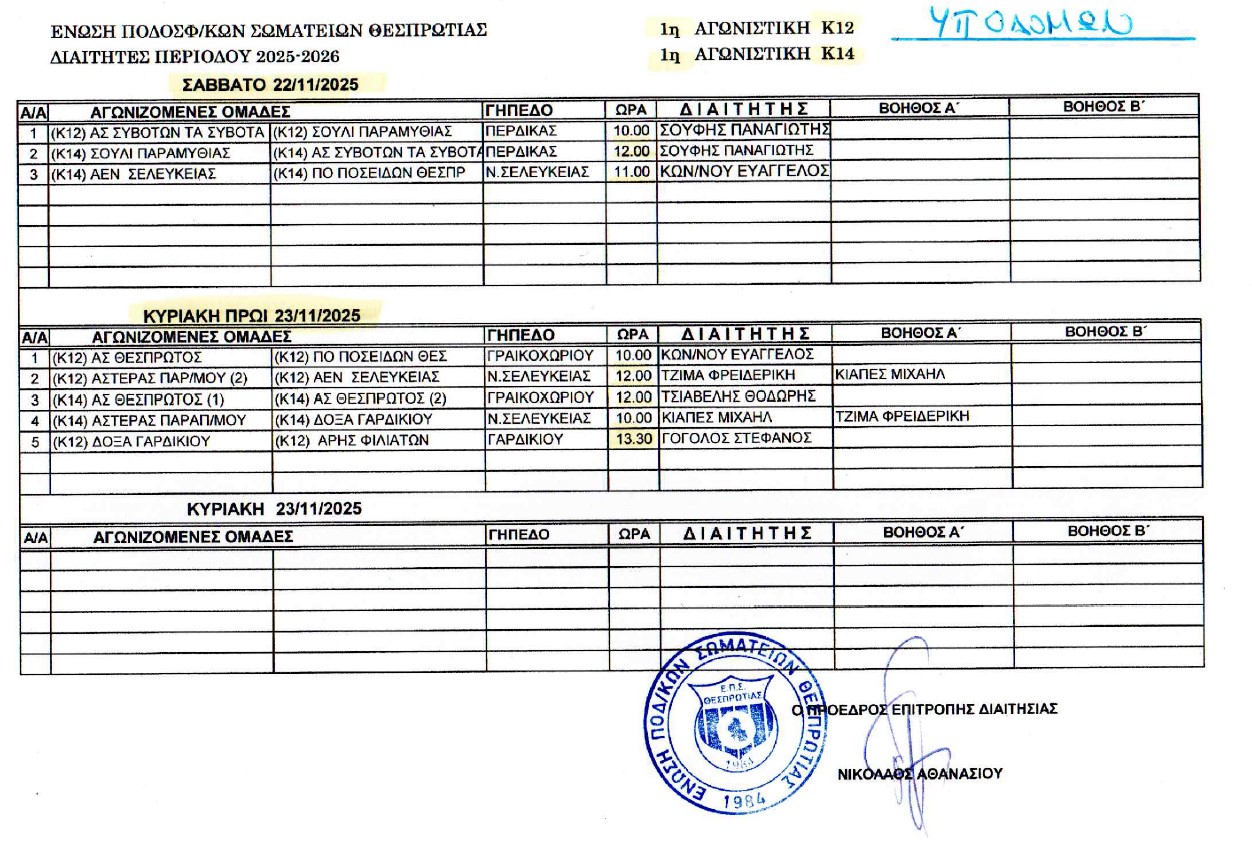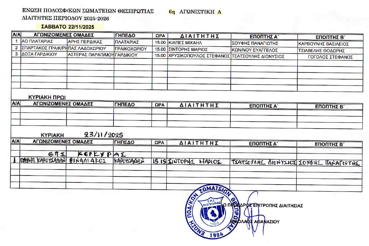 ΕΠΣ | Το πρόγραμμα και οι διαιτητές του Σαββατοκύριακου στα γήπεδα της Θεσπρωτίας Της Α Κατηγορίας και των Υποδομών. Ρεπό το Σούλι Παραμυθιάς 22|11|2025