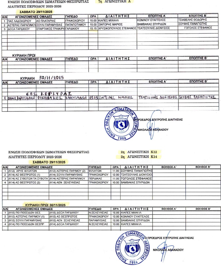 ΕΠΣ | Το πρόγραμμα και οι διαιτητές του Σαββατοκύριακου στα γήπεδα της Θεσπρωτίας Της Α Κατηγορίας και των Υποδομών. 28|11|2025
