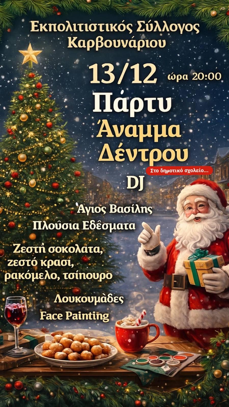 Ο Εκπολιτιστικός Σύλλογος Καρβουναρίου σας προσκαλεί στην πιο μαγική και χριστουγεννιάτικη εκδήλωση του χρόνου: το Πάρτυ Ανάμματος Δέντρου!