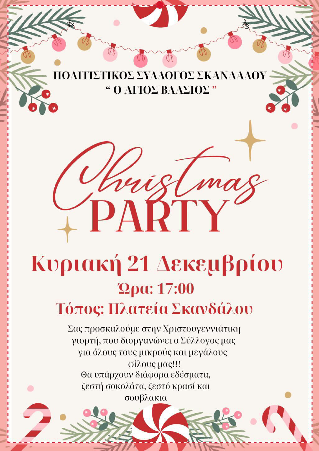 Ο Πολιτιστικός Σύλλογος “Αγίος Βλάσης” σας προσκαλεί στη Φωταγώγηση του Χριστουγεννιάτικου Δέντρου, που θα πραγματοποιηθεί στο Σκάνδαλο την Κυριακή 21 Δεκεμβρίου.