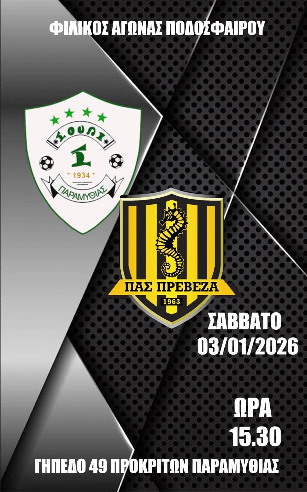 Με ένα σημαντικό φιλικό παιχνίδι ξεκινά η ποδοσφαιρική δράση για το 2026 για την Παραμυθιά, οπου αυριο Σάββατο θα αντιμετωπίσει τον ΠΑΣ Πρεβεζας στο γήπεδο 49 Προκρίτων.