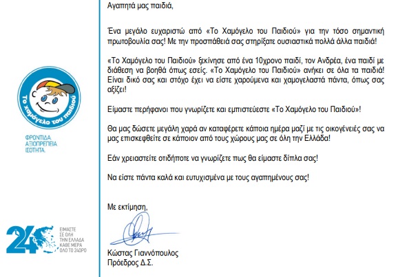 Στην επιστολή τονίζεται ότι: Η πρωτοβουλία αυτή αποτελεί ουσιαστική στήριξη για πολλά παιδιά. Ο οργανισμός αισθάνεται περήφανος για την εμπιστοσύνη που δείχνουν οι μαθητές στο έργο του. «Το Χαμόγελο του Παιδιού» ανήκει σε όλα τα παιδιά και στόχος του είναι να παραμένουν πάντα χαρούμενα, όπως τους αξίζει.