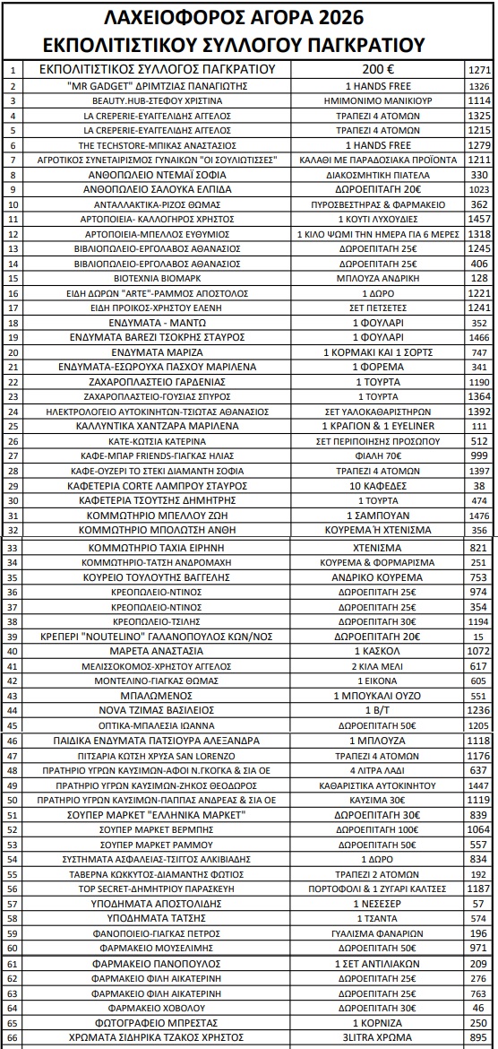 Τα αποτελέσματα της Λαχειοφόρου Αγοράς του Πολιτιστικού Συλλόγου Παγκρατίου