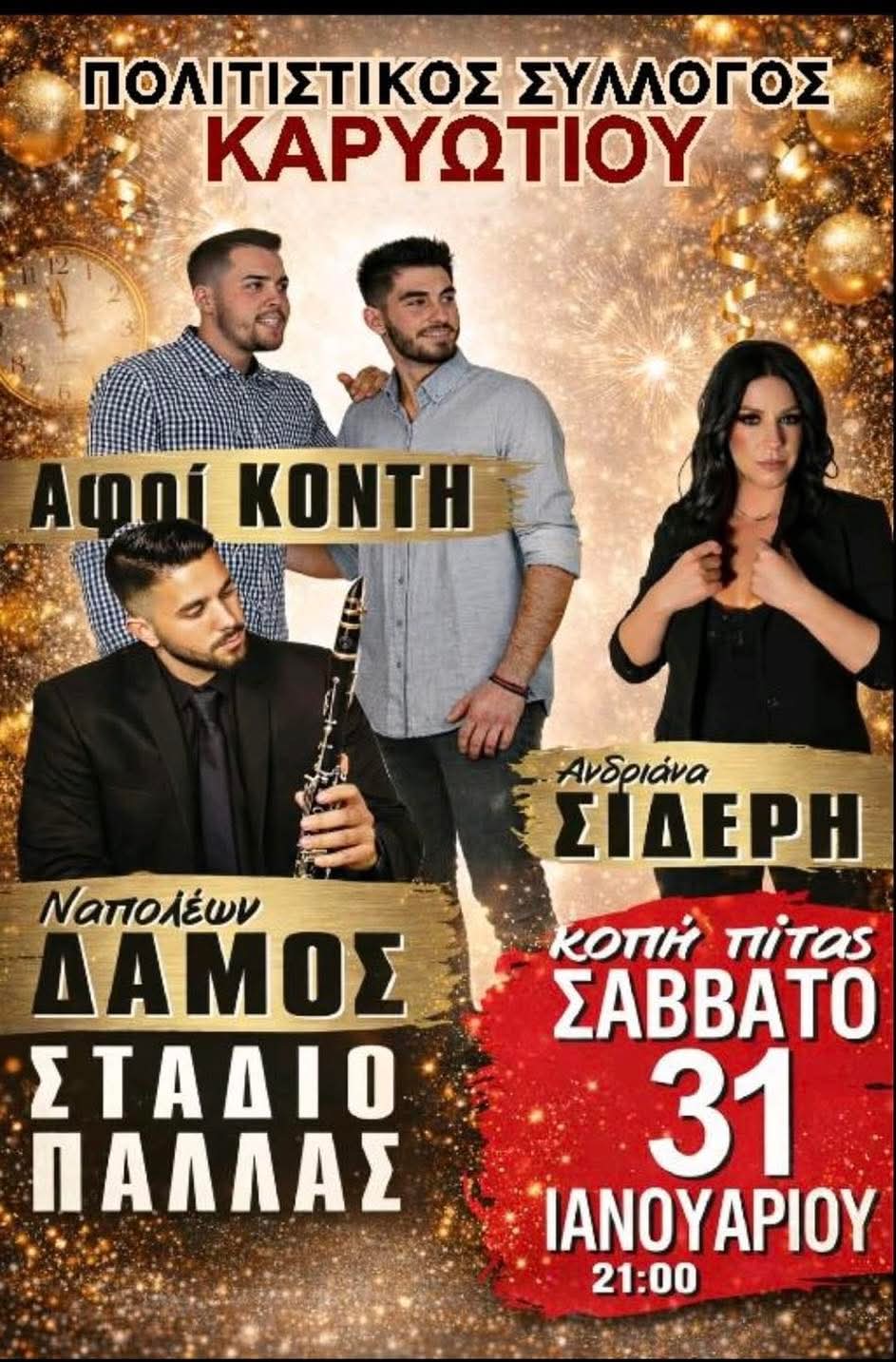 Ο Πολιτιστικός Σύλλογος Καρυωτίου σάς προσκαλεί με μεγάλη χαρά στην ετήσια εκδήλωση για την κοπή της πρωτοχρονιάτικης πίτας! Ελάτε να γιορτάσουμε μαζί το ξεκίνημα του 2026 με πολύ κέφι, φαγητό και μουσική.