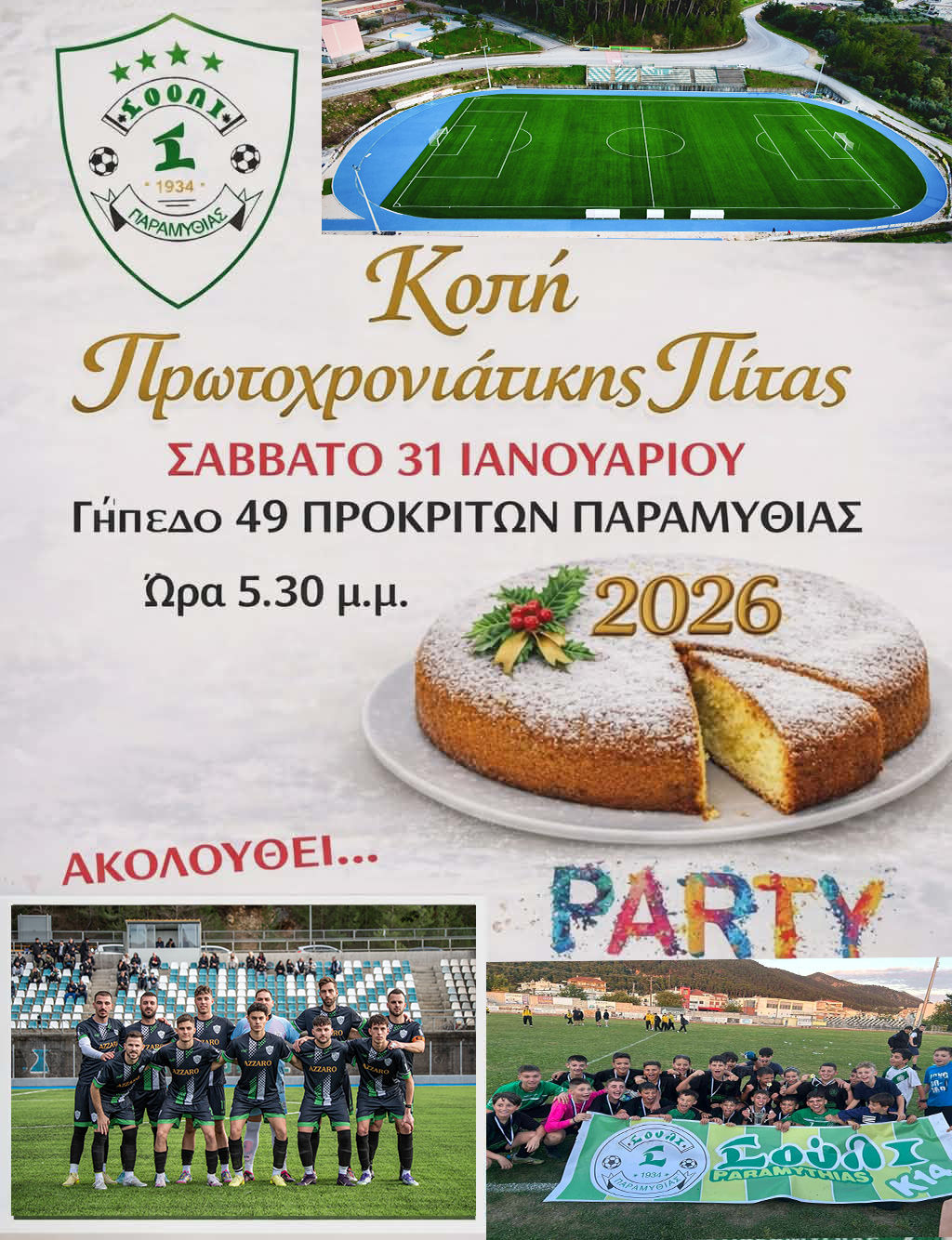 Προσκαλούμε όλους τους φίλους και τα μέλη της ομάδας μας το Σάββατο 31.01.2026 και ωρα 17.30 στο γηπεδο 49 ΠΡΟΚΡΙΤΩΝ ΠΑΡΑΜΥΘΙΑΣ για την καθιερωμενη κοπη της πρωτοχρονιάτικης πίτας για το 2026.