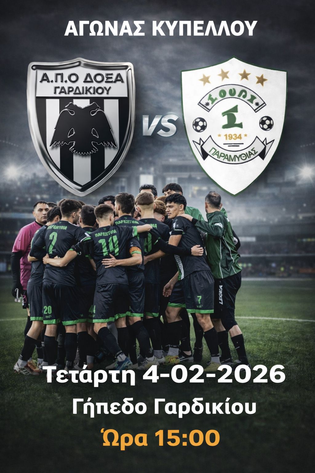 Τοπικό ντέρμπι σήμερα για το Κύπελο με την Δόξα Γαρδικίου να υποδέχεται το Σούλι Παραμυθιάς Στις 15:00 04|02|2026