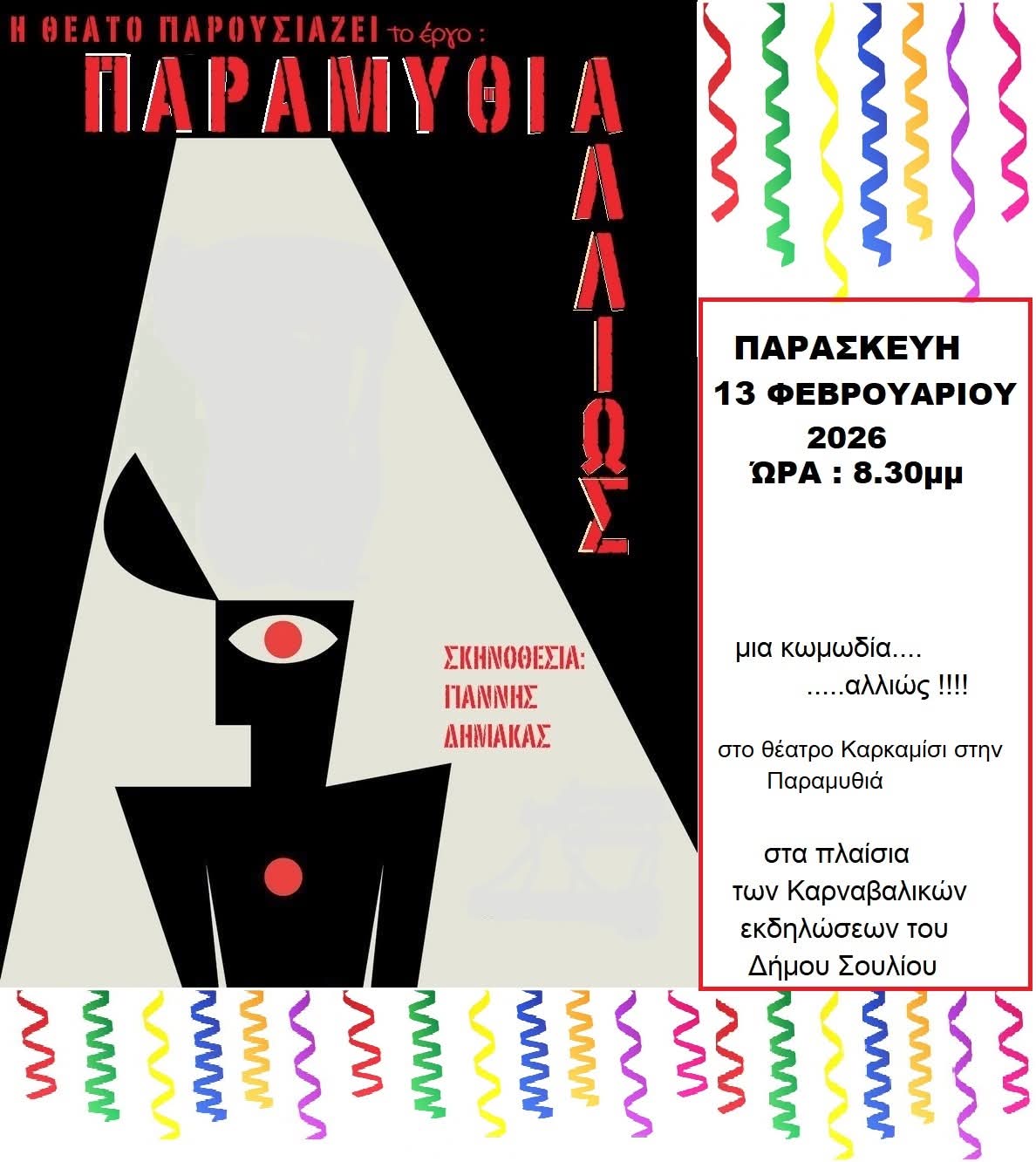 Με την ευκαρία του καρναβαλιού θα δοθεί μια και μοναδική παράσταση γεμάτη με χρωματιστά κουστούμια , γέλιο και δράση που συνθέτει μια κωμωδία που εντάσσεται στην κοινωνικοπολιτική σάτιρα ! οπότε ναι ! σας περιμένουμε την Παρασκευή 13-2-26 στις 8.30μμ στο θέατρο στο Καρκαμίσι στην Παραμυθιά να περάσουμε όμορφα με ένα “ΠΑΡΑΜΥΘΙ….ΑΛΛΙΩΣ”.