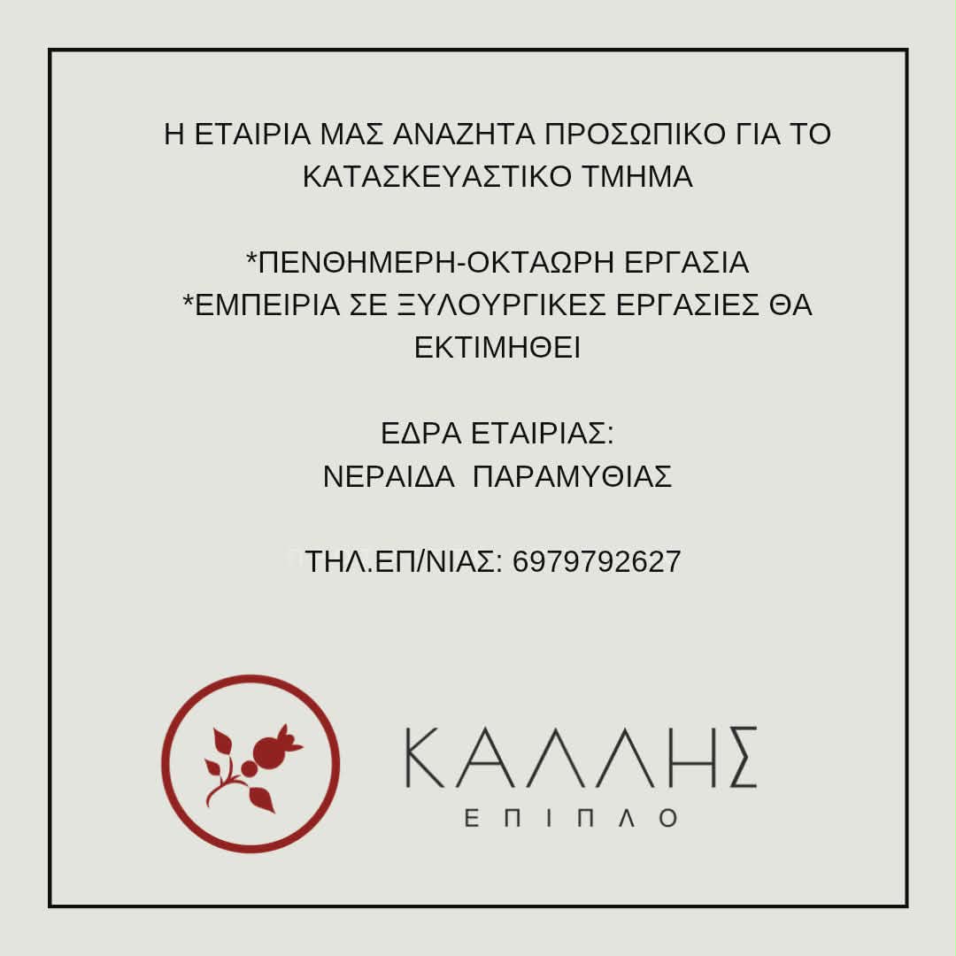 Η εταιρεία “ΚΑΛΛΗΣ ΕΠΙΠΛΟ” αναζητά προσωπικό για εργασία