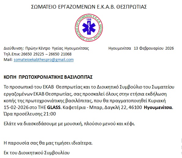 Το Σωματείο Εργαζόμενων ΕΚΑΒ Θεσπρωτίας, κόβει την πίτα του Το βράδυ της Κυριακής στο "The Glass" 14|02|2026
