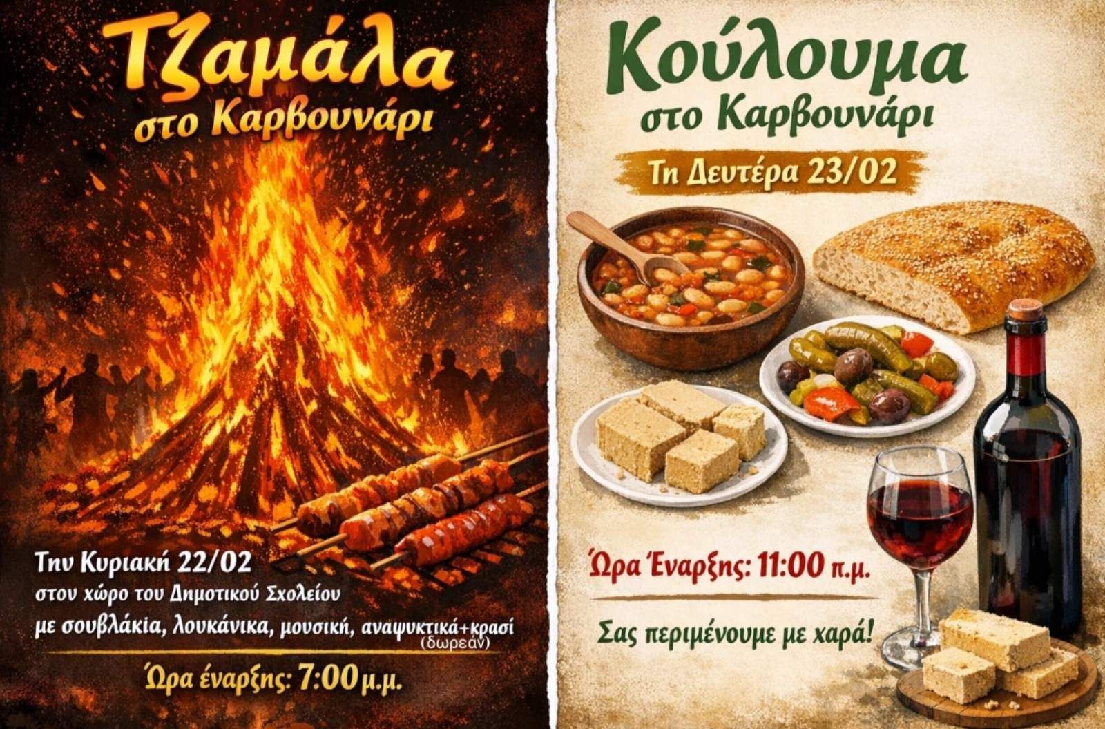 Ο Πολιτιστικός Σύλλογος Καρβουναρίου προσκαλεί κατοίκους και επισκέπτες σε ένα αυθεντικό διήμερο, τιμώντας τα έθιμα της Αποκριάς και της Καθαράς Δευτέρας.