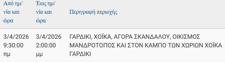 Προκειμένου να προγραμματίσετε τις εργασίες σας και να ελαχιστοποιηθεί η όχλησή σας, στον ακόλουθο πίνακα, μπορείτε να ενημερωθείτε για τις περιοχές και τις ώρες προγραμματισμένων διακοπών ηλεκτροδότησης.