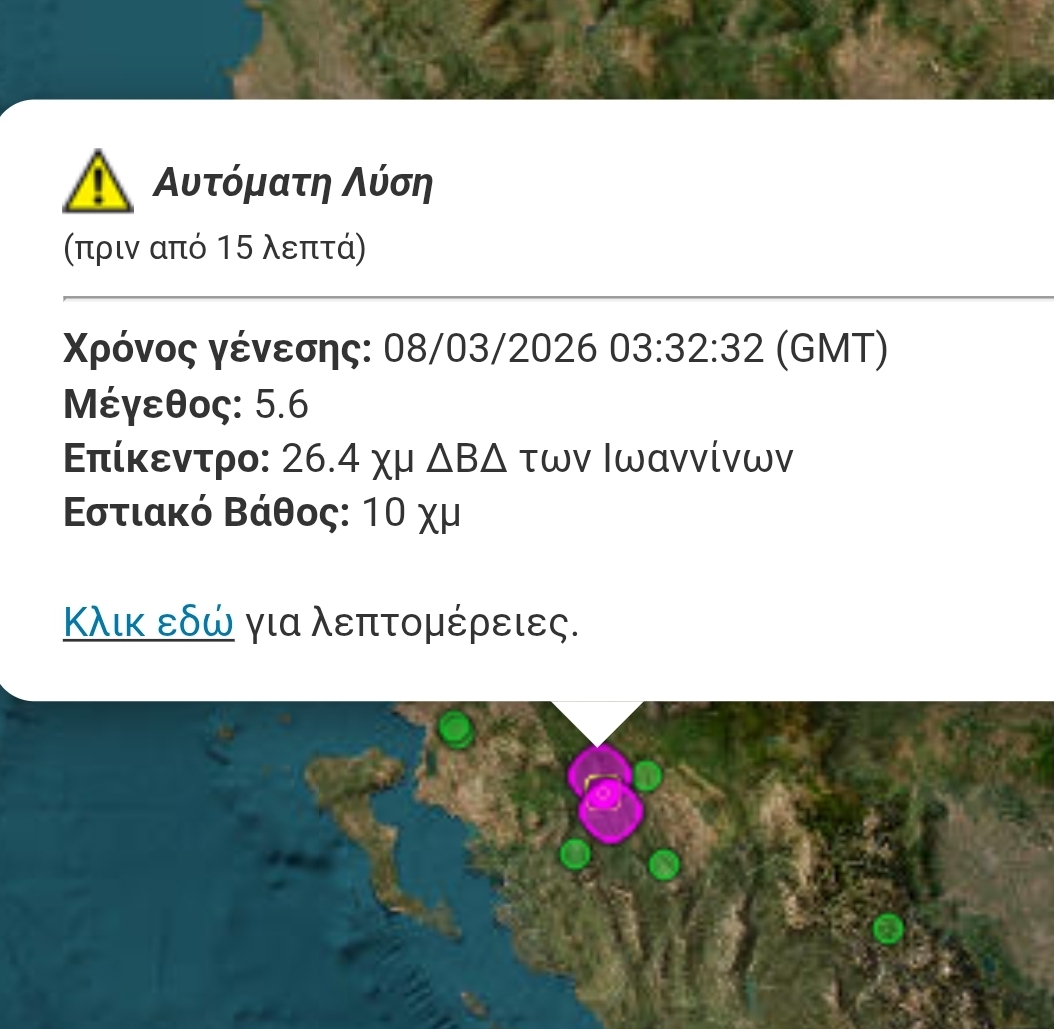 Σεισμική δόνηση μεγέθους 5,6 βαθμών της κλίμακας Ρίχτερ σύμφωνα με τα πρωτα στοιχεία του γεωδυναμικού ινστιτούτου, σημειώθηκε 5:32 το πρωί της Κυριακής, 26 χλμ Δυτικά Βορειοδυτικά των Ιωαννίνων.