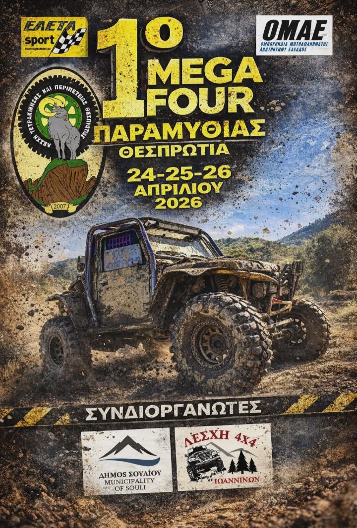 Η Λέσχη Τετρακίνησης και Περιπέτειας Θεσπρωτίας ανακοίνωσε τη διοργάνωση του πρώτου MEGA FOUR στη Θεσπρωτία, που θα πραγματοποιηθεί στην Παραμυθιά, το τριήμερο 24, 25 και 26 Απριλίου