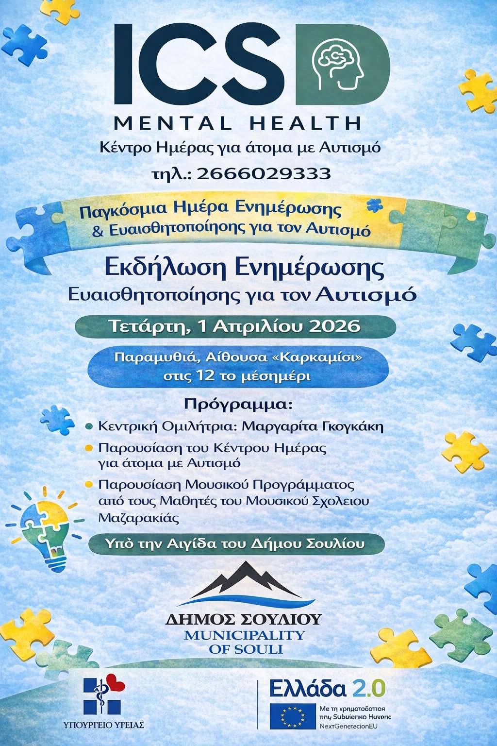 Με αφορμή την Παγκόσμια Ημέρα Ενημέρωσης και Ευαισθητοποίησης για τον Αυτισμό (2 Απριλίου), το Κέντρο Ημέρας για Άτομα με Αυτισμό στη Γκρίκα Θεσπρωτίας του Διεθνούς Κέντρου για τη Βιώσιμη Ανάπτυξη – ICSD διοργανώνει τρεις δράσεις με στόχο την ενίσχυση της γνώσης, της αποδοχής και της ουσιαστικής συμπερίληψης των ατόμων στο φάσμα του αυτισμού στην τοπική κοινωνία.