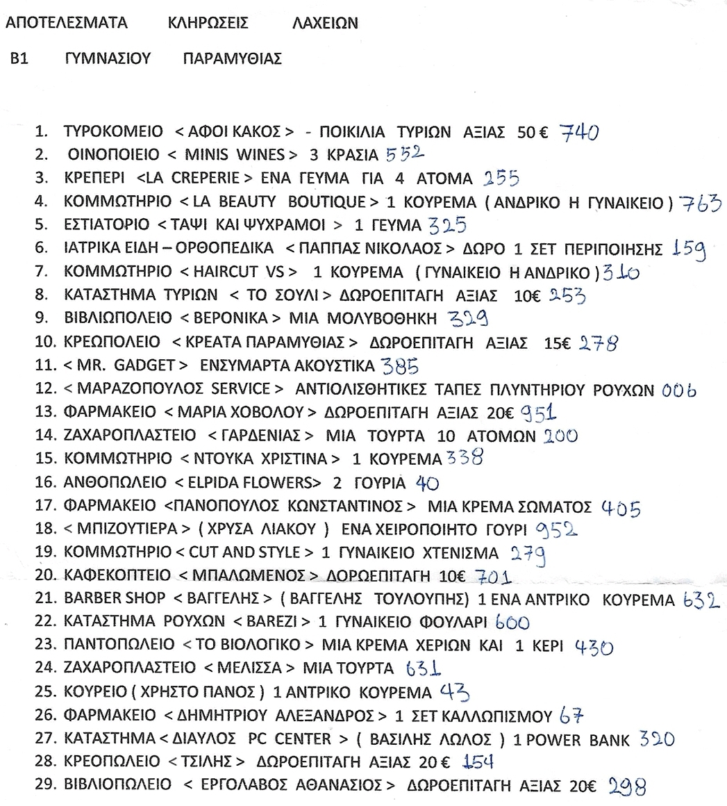Τα αποτελέσματα της Λαχειοφόρου Αγοράς της Β1 Γυμνασίου Παραμυθιάς