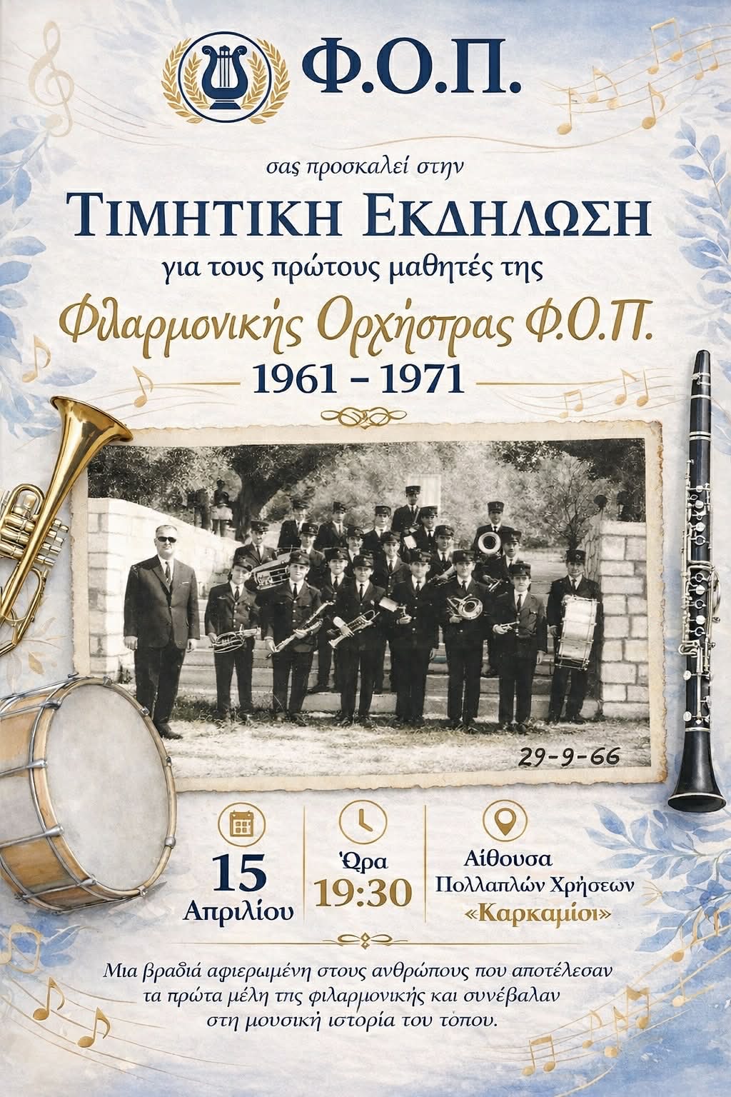 Μια ιδιαίτερη βραδιά μνήμης και πολιτισμού διοργανώνει ο Φ.Ο.Π., προσκαλώντας το κοινό σε μια Τιμητική Εκδήλωση αφιερωμένη στους πρωτεργάτες της μουσικής του παράδοσης.