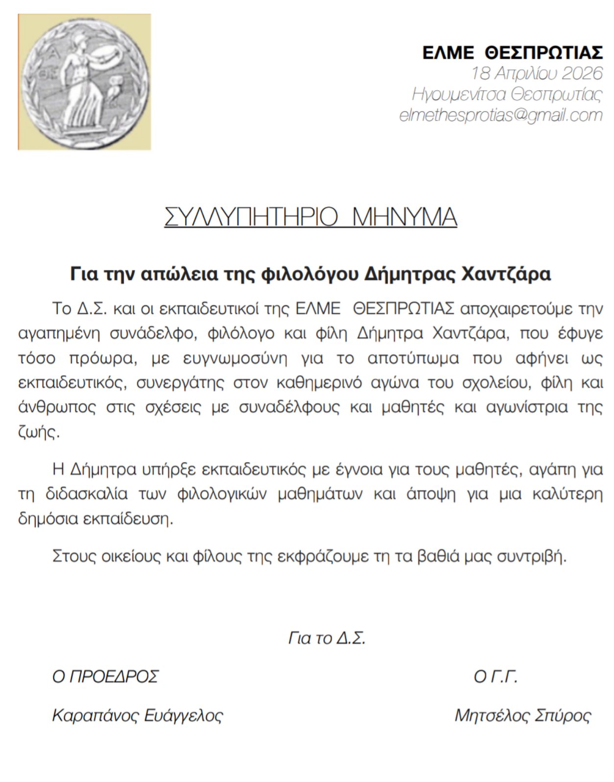 Συλλυπητήριο μήνυμα της ΕΛΜΕ Θεσπρωτίας για την απώλεια της Δήμητρας Χαντζαρας