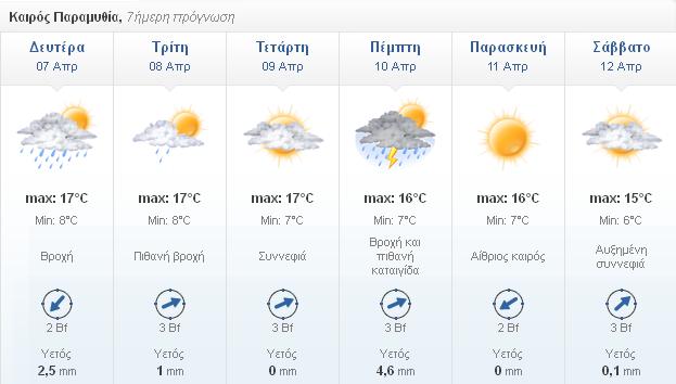 Πέμπτη: Βροχή και πιθανή καταιγίδα. Θερμοκρασία από 7 μέχρι 16 βαθμούς Κέλσιου και ανέμους νοτιοδυτικούς 3 μποφόρ.